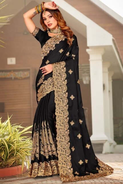 Black Satin Blend Embroidered Saree Party Wear