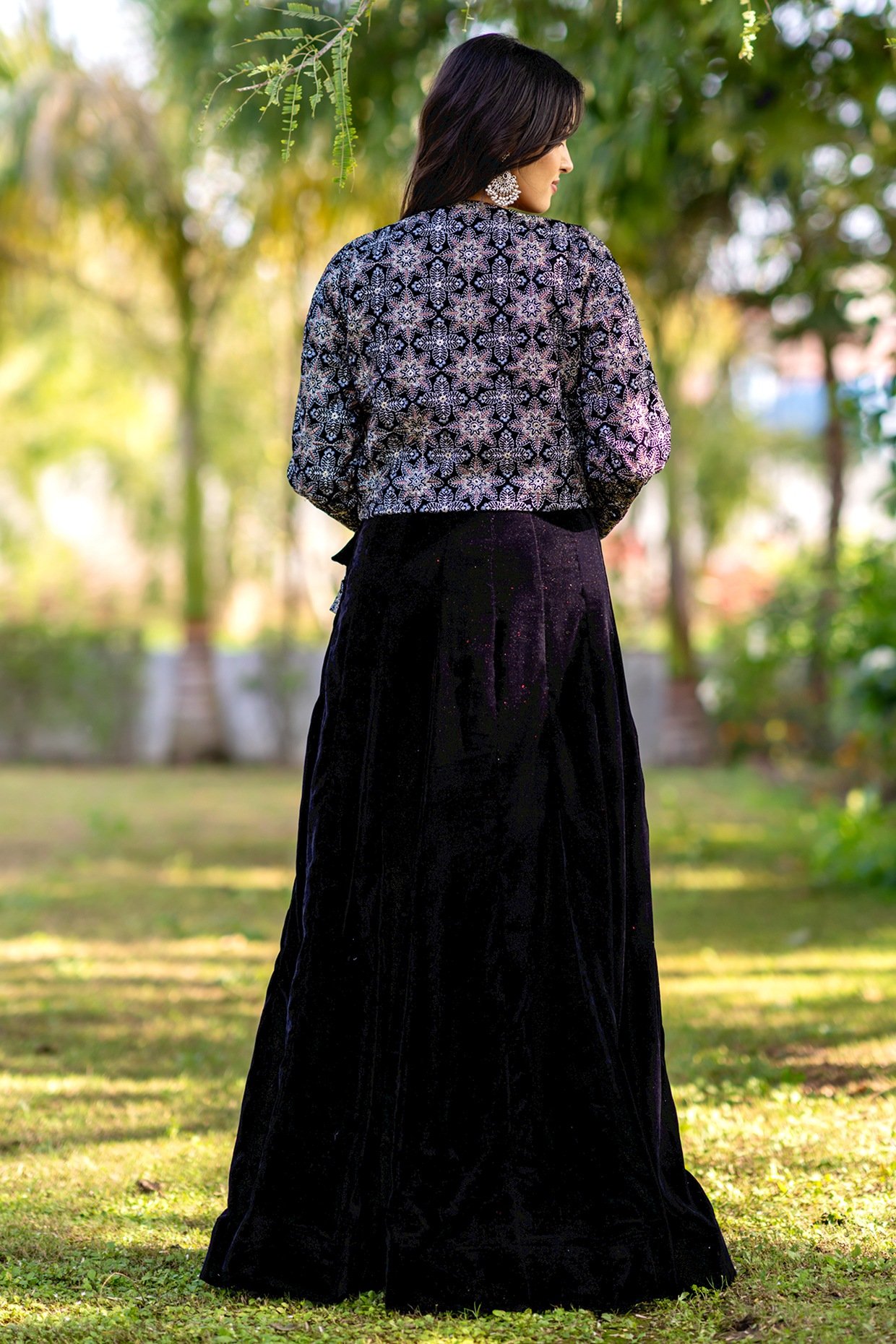 Featuring a black lehenga in velvet base with embellishments. It is paired with a blouse and a jacket. Accentuate it with statement jewellery and heels for a sangeet ceremony.
