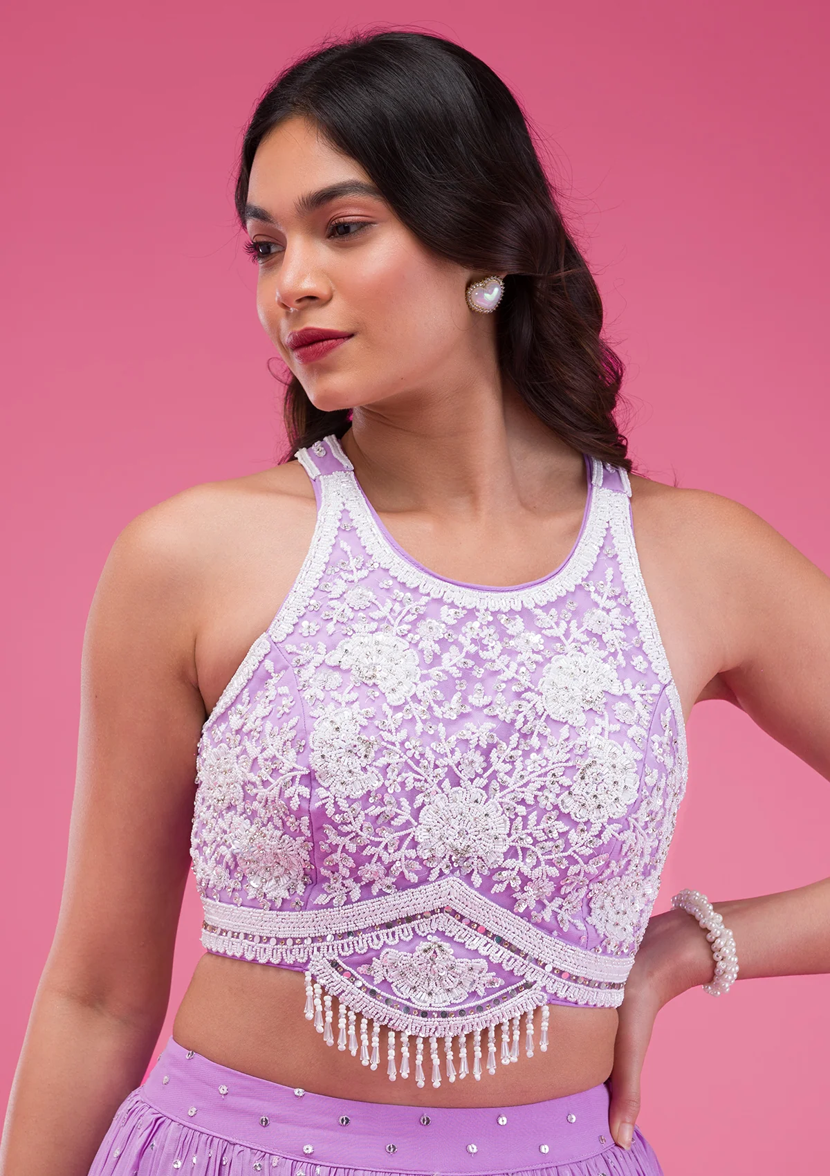 Twirl with joy in Lavender Lehenga, where the elegance of georgette meets the timeless charm of pearlwork embroidery. Each fold of this stunning skirt sparkles with playful pearls, complemented by a gracefully designed top that flaunts vibrant patterns and intricate details, ideal for making your every moment celebratory. Experience the blend of traditional craftsmanship and contemporary style with this mesmerizing attire that is as spirited and lively as you are!.