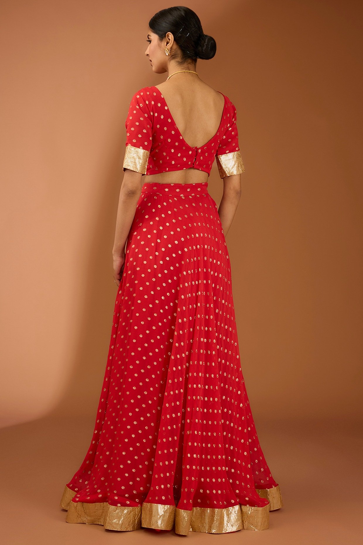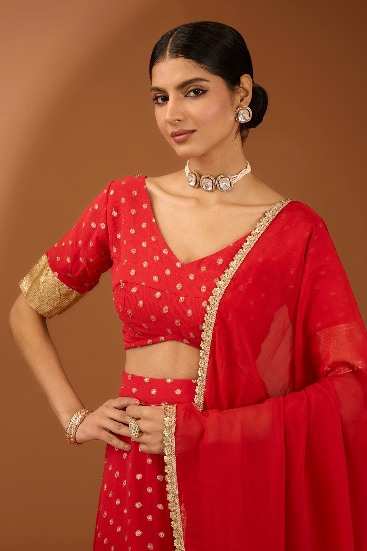 Featuring a red lehenga in a georgette base with lace work. It is paired with a blouse having a V-neckline and a dupatta. Accentuate it with statement jewellery and heels for a wedding or sangeet ceremony.
